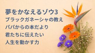 生き方を考える 『夢をかなえるゾウ3 ブラックガネーシャの教え』要約・感想|“人生を動かす力”【パパからの本だより】 『夢をかなえるゾウ3 ブラックガネーシャの教え』の要約と感想です。人生は他力本願では変わらず、夢は具体的な行動の積み重ねでしか叶わない。痛みの意味を変え、小さな一歩を続けることの大切さを、パパから子供たちへやさしく伝えます。 2026.03.05 生き方を考える