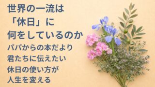 心を整える 『世界の一流は「休日」に何をしているのか』要約・感想|“休日の使い方が人生を変える”【パパからの本だより】 『世界の一流は「休日」に何をしているのか』の要約と感想です。休日は疲れてから休む日ではなく、人生を整える戦略的な時間。休養と教養を両立させる休日設計、土曜=チャレンジ、日曜=リフレッシュの考え方、自己効力感を高める習慣を、パパから子供たちへやさしく伝えます。 2026.03.08 心を整える