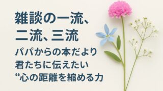 人とつながる力 『雑談の一流、二流、三流』書評|パパからの本だより:君たちに伝えたい “心の距離を縮める力” 雑談はうまく話す技術ではなく、心の距離を縮める力。『雑談の一流、二流、三流』から、相手の気持ちに寄り添う会話のコツと、日常でやさしく使える「心をひらく雑談」の方法をまとめました。パパから子どもたちへ、やさしく人とつながるための手紙です。 2025.11.07 人とつながる力